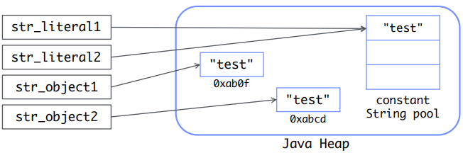 하지만, 인스턴스로 선언한 경우에는 서로 다른 객체를 생성하고 그 안에 "test"를 참조하고 있다.