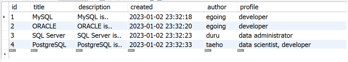 | MySQL 문법(1) - select * from, insert into values 등등 (0) | 2023.01.02 |