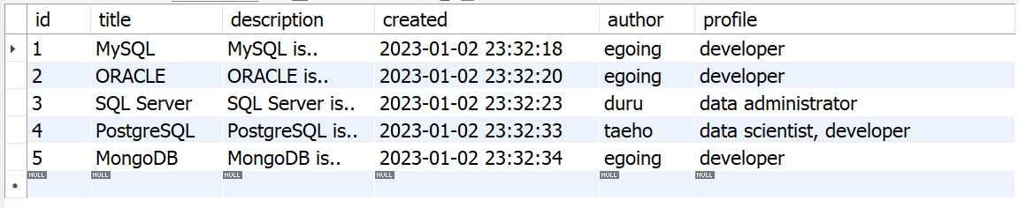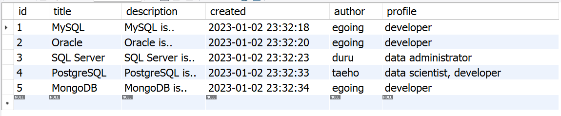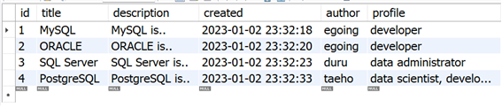 | MySQL 문법(1) - select * from, insert into values 등등 (0) | 2023.01.02 |